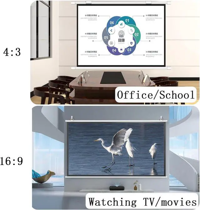 The screen has two ratios: 16:9 and 4:3. The 16:9 ratio is suitable for home theaters, games, and KTVs, and the 4:3 ratio is suitable for workplaces such as business, offices, schools, and educational PPT.
