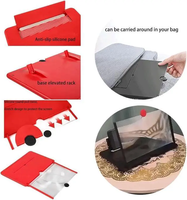 Lightweight and Foldable : The HD Screen Magnifier is a lightweight and foldable portable magnifier. It has a ring stand that can adjust the height to suit different needs. It is very thin when folded, making it easy to carry around in your bag