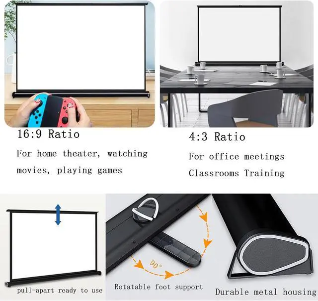 The projection screen has 30in/40in/50in (diagonal) and 16:9/4:3 screen ratio, whether you are watching your favorite movies, sports events, or giving impactful presentations, this screen is guaranteed to The image is clear, vivid and realistic.