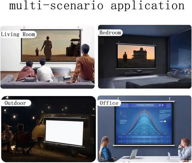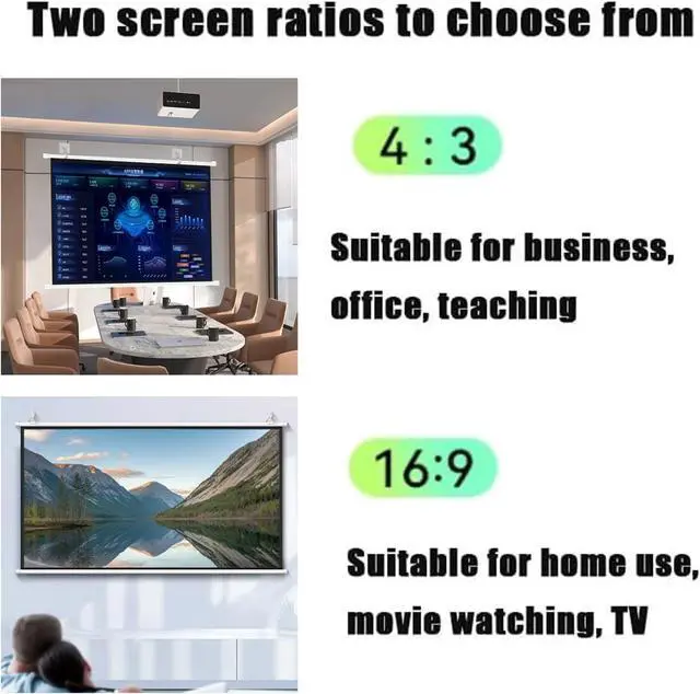 The screen has two ratios: 16:9 and 4:3. The 16:9 ratio is suitable for home theaters, games, KTV, and the 4:3 ratio is suitable for workplaces such as business, offices, schools, and educational PPT.