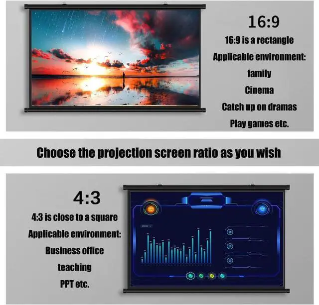 • Best Versatility: Available in 60-inch/72-inch/80-inch different sizes, 16:9/4:3 aspect ratio, from office meetings to home theaters, from schools to business centers, the projector s