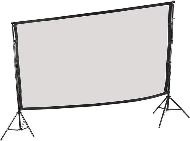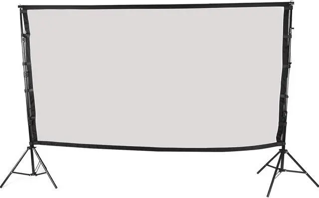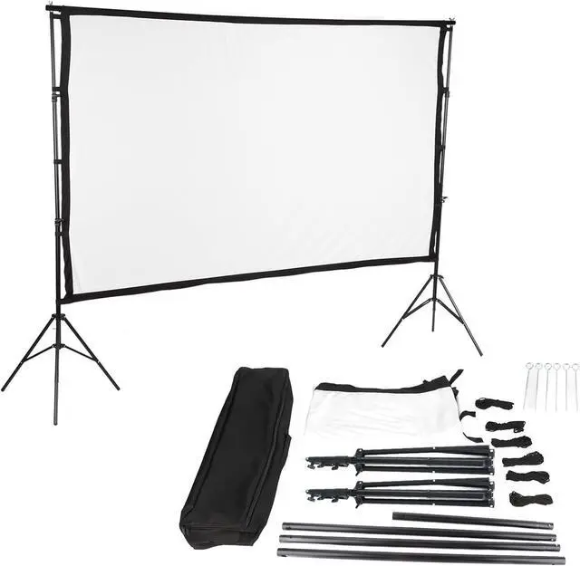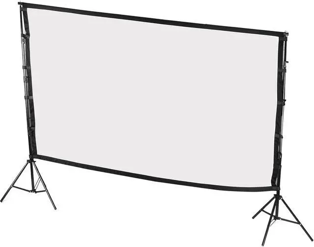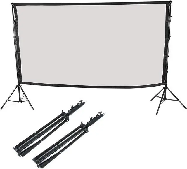 [Stable Dual Tripod Design] Designed for stability this projector screen features a robust dual tripod stand with a triangular base that prevents wobbling even in light breezes. the reinforced screen edges allow for easy post insertion maintaining picture integrity. this sturdy construction ensures your screen stays securely in place during indoor or outdoor use.