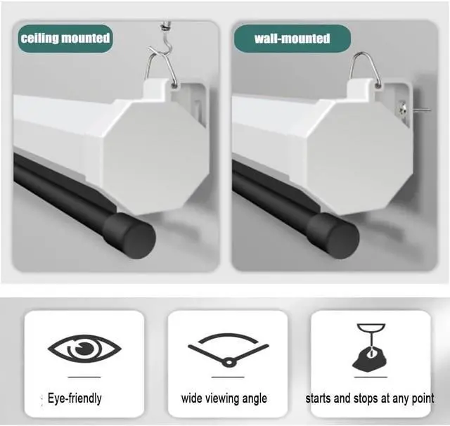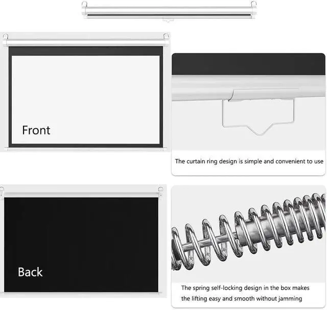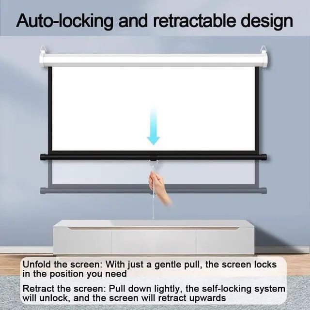 Easy to install: The adjustable projection screen can be mounted on the wall or ceiling. It locks automatically when pulled and stopped, and can be easily retracted by gently pulling the strap