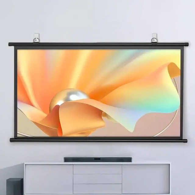 Portable projection screen: The manual pull-down projection screen is easy to transport and store, can be wall-mounted, and is easy to roll up to save space. Suitable for indoor and outdoor use. Suspended screen for projector. Two adjustable hooks help you hang your projector screen easily.