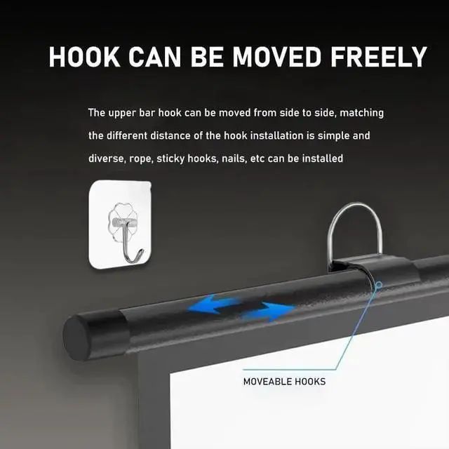 HD projector screen manual pull down hanging clasp can be moved freely, the upper bar hanging clasp can be moved left and right to match the hooks of different distances. Simple and diversified installation, rope, sticky hooks, nails and so on can be installed