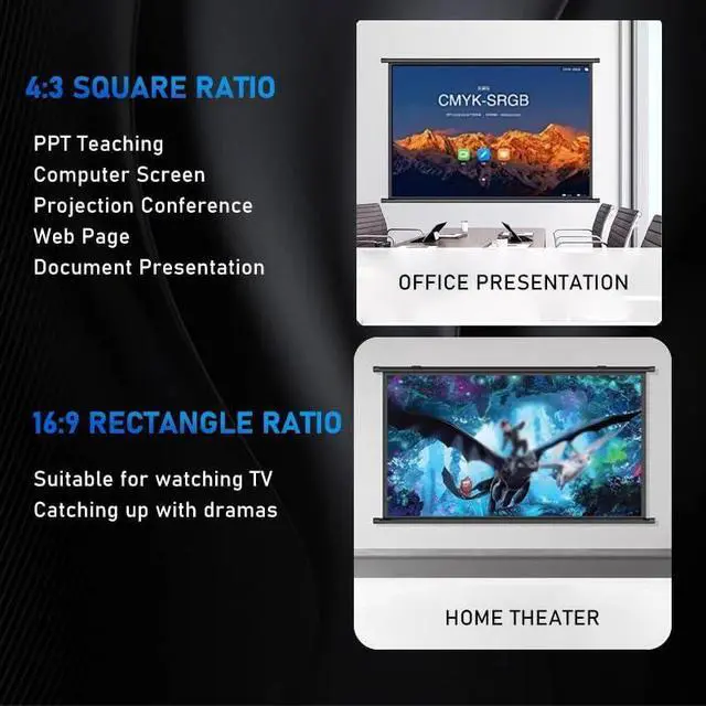 Reel projector screen is suitable for a variety of scenarios, hole-free installation, ready to stick, compact, lightweight and easy to carry, home/office/outdoor/bedroom/commercial can be convenient for you