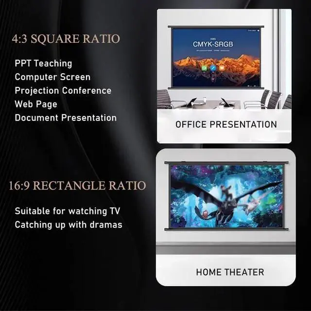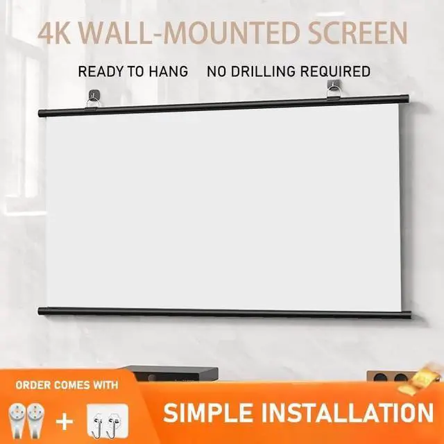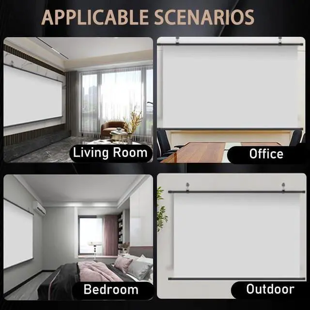 Reinforced wall mounted upper and lower rods can stabilize the curtain position for a better movie watching experience. HD projector screen multi-scene widely applicable, not limited to home, business office, Karaoke, meeting training, watching movies, indoor advertising projection, outdoor projection