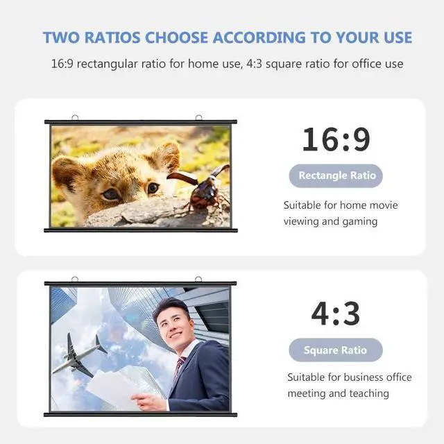 Design: convenient projection screen for 30 inches 40 inches 50 inches 60 inches 72 inches 16:9/4:3 screen ratio for manual projector screen, you can choose the right screen ratio and size according to your needs