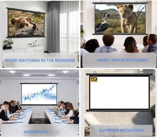 Material: manual pull-down projector screen is made of white fiberglass material, the screen is flat and wrinkle-free, the color is bright and true. Suitable for indoor and outdoor projection use
