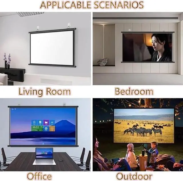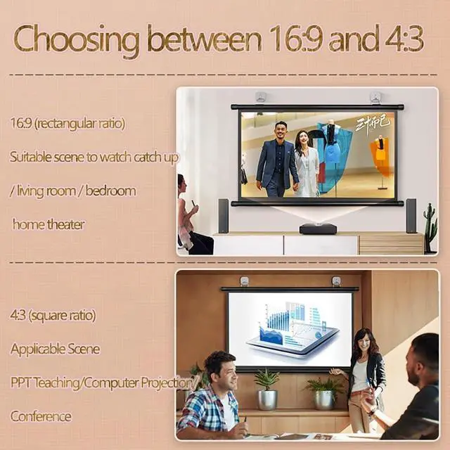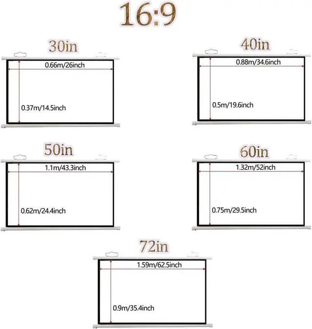 Size: 30 inches, 40 inches, 50 inches, 60 inches, 72 inches projection screen, available in 16:9/4:3 aspect ratio, it is lightweight and portable, and can be easily rolled up and stored manually