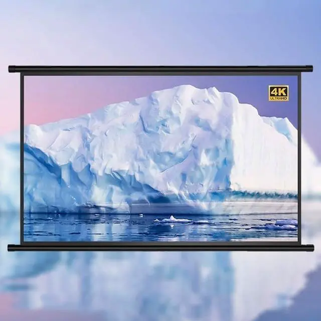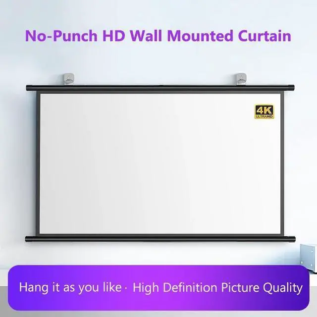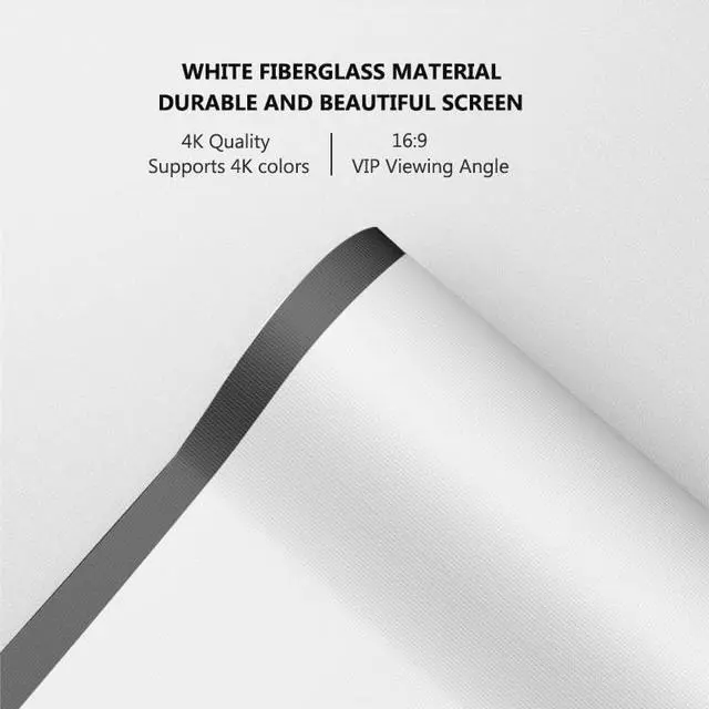 Screen Material: The projector screen is made of white fiberglass material, no wrinkles, the material is durable and can be easily cleaned by wiping with a damp cloth. The wall mounted up and down rods provide stability during use and hold the screen in place so that it is flat and not curled, and the scroll design is easy to carry and store