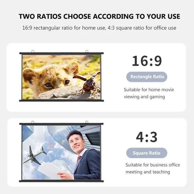 Projection screen size: this movie projection screen has 30 inches 40 inches 50 inches 60 inches 72 inches, 4:3/16:9 format, you can choose the right projector movie screen according to your needs