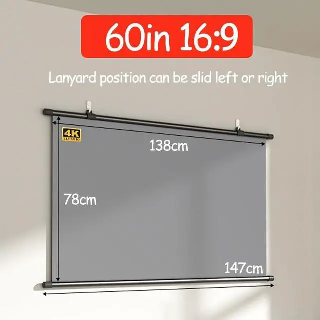 Dimensions: Diameter approx. 60 inches (4:3), Angle of view: 124x90cm, Diameter of approx. 60 inches (16:9), Angle of view: 138x78cm, Diameter of approx. 72 inches (4:3), Angle of view: 147x110cm, Diameter of approx. 72 inches (16:9), Angle of view: 147x82cm