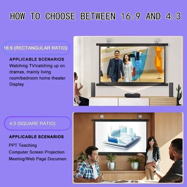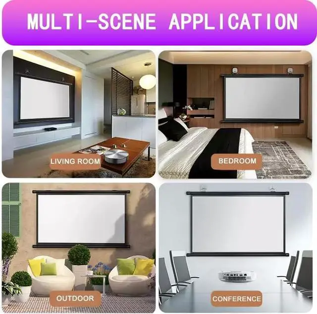 Simple and easy to install, the manual projection screen can be easily set up in minutes and can be hung on the wall, in your home, conference room or other places