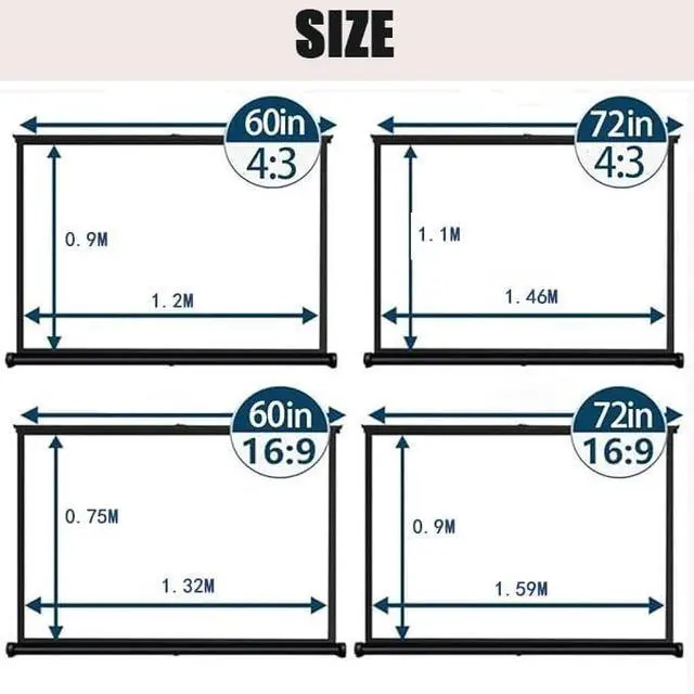 Material: Manual projection screen is made of high-quality white fiberglass material, with real color rendering and good anti-light transmission effect, bringing you and your family a high-definition visual experience