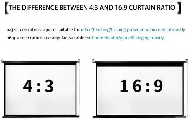 Choice: 4:3 screen ratio is square, suitable for office/teaching/training projection/commercial mostly 16:9 screen ratio is rectangular, suitable for home theater/gaming/K-Ray, you can choose the right screen format according to your needs