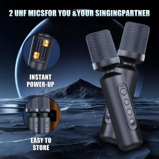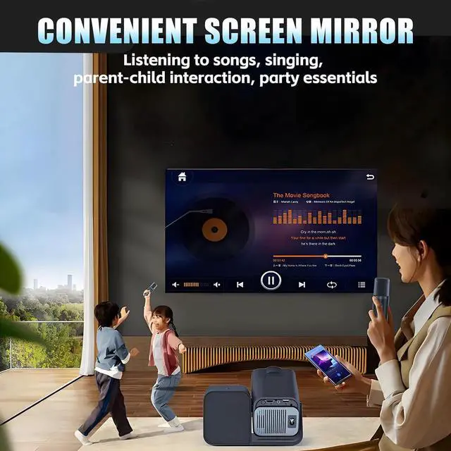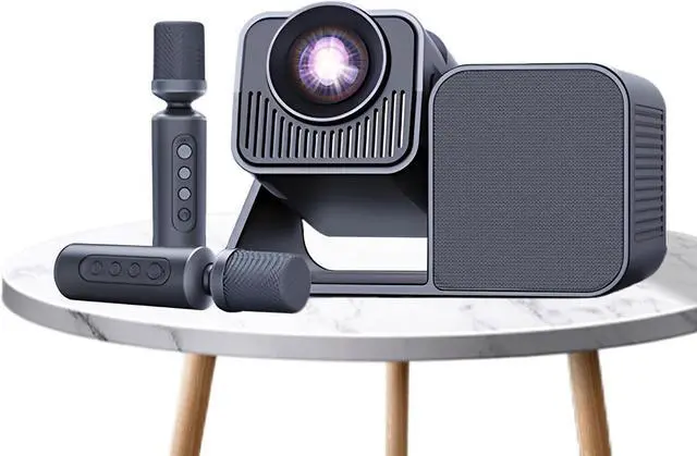 The World's First 3 - in - 1 Projection KTV Speaker SystemThis smart home is not Just a Projector, but Also a Speaker and an Ultimate KTV. It seamlessly combines the functions of a projector, a speaker and a karaoke machine, coming with a pair of microphones so that you and your partner can join in the joyful chorus. With a dual channel speaker design and 2*15W power output, fills the room with immersive stereo sound. It's perfect for hosting movie parties indoors or outdoors, listening to music, or making important announcements in the office with the included microphone