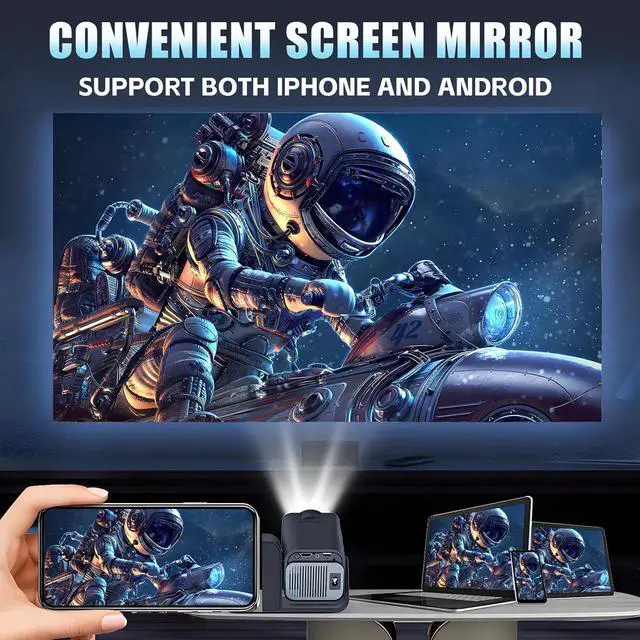 WiFi6 & BT 5.0 and 180°Flexible RotationThis wireless projector comes equipped with a Dual - band WiFi6 + BT5.0, offers significantly higher speeds and more stable connections, allowing you to stream high - definition content without buffering. Enables seamless pairing with various Bluetooth devices, such as speakers or headphones, for a personalized audio experience. Its unique 180°swivel feature allows the projector to be pointed in multiple directions, so you can point the projector at the ceiling or wall of your bedroom. Enjoy a high-quality visual experience both indoors and outdoors