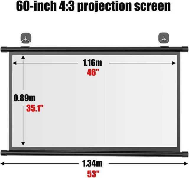 The portable HD projection screen can turn your living room or outdoor lounge area into a movie theater in minutes with stunning visual effects, creating a new visual experience for you and your family and friends. FEATURES: dustproof, flat and easy to clean. TWO MOUNTING METHODS: You can adjust the hooks left and right to mount on the wall and ceiling. BLACK FRAME DESIGN: Not only frames the picture, but also enhances the overall image contrast, giving you a comfortable visual experience. Usage: Manual pull down. Product Name: Projection Screen Product Material: Fiberglass Product type: wall mounting Product Size: 60 inches/72 inches/80 inches Product ratio: 4:3/16:9 Package include: 1 x projector screen + 2 x hooks Attention: 1. Due to manual measurement, the size error is 1-2 cm. 2.Before purchasing, please make sure the selected size meets your needs.