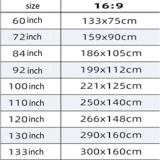 Format & Size 16:9 screen format, 60 inches , 72 inches , 84 inches , 92 inches , 100 inches , 110 inches , 120 inches , 130 inches , 133 inches