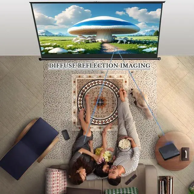 Manual Drop-Down: The projector screen rolls down for storage. The white screen is framed by a black border that enhances the image's color and contrast