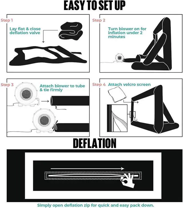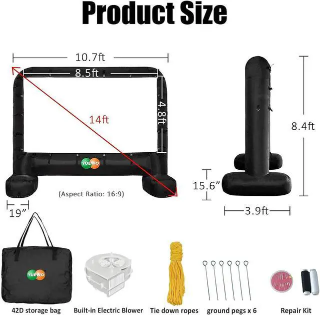 14ft Inflatable Mega Movie Screen: Ever dreamed of having big screen home theater that is mobile? We have designed 3 different models: 14ft, 16ft, 20ft to perfectly fit all needs of indoors and outdoors using. This outdoor movie projector and screen system comes with a large daily storage bag for you to take to wherever you want. Great for camping adventures, picnics, and outdoor birthday, pool party, and wedding parties. If you like watching movies, don't miss our inflatable screen.