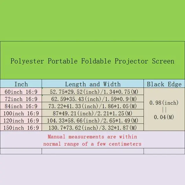 SIZE: screen from 60 inch16:9,2 inch 16:9,84 inch16:9,100 inch16:9,120 inch16:9,150 inch16:9.wide allowing it to accommodate different sized projectors and room dimensions.