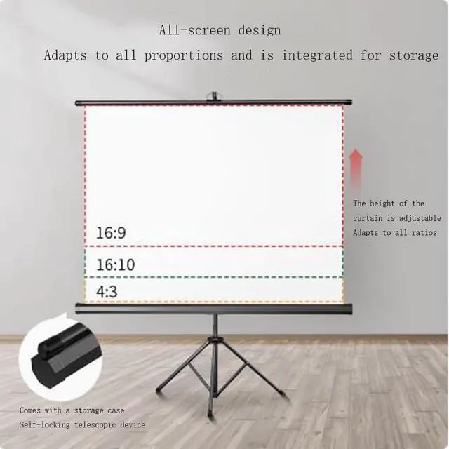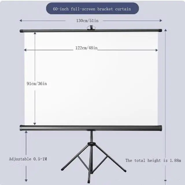 60-inch projector screen: the best screen size for indoor and outdoor, the full screen design adapts to all ratios, 16:9/16:10/4:3 integrated storage, the screen height can be adjusted, and it adapts to all proportions of the screen