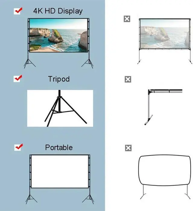 Portable stand screen is a projection display device with a lightweight foldable stand, can be quickly assembled and stored, easy to carry to home, outdoor, office and other scenes, flexible to adapt to the needs of projection