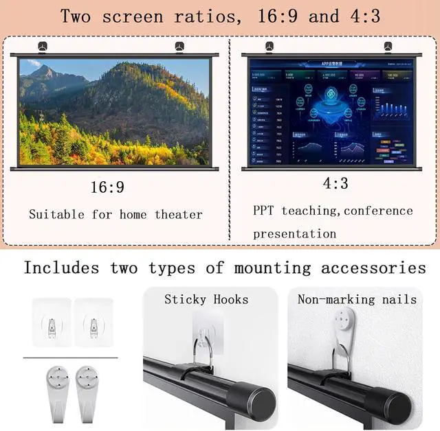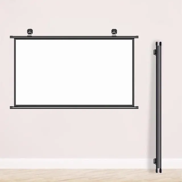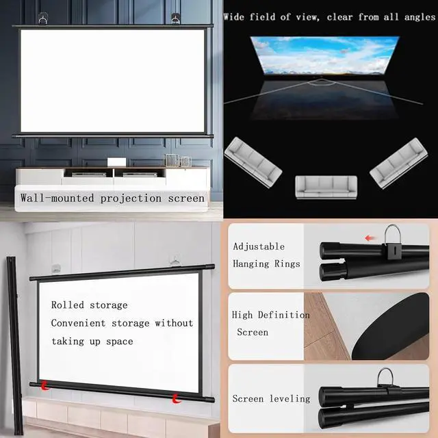 The wall-mounted projection screen is quick and easy to install and does not require any tools. Use the included adhesive hooks to install it on the wall, saving space. The hanging rings are flexible and can be adjusted freely.