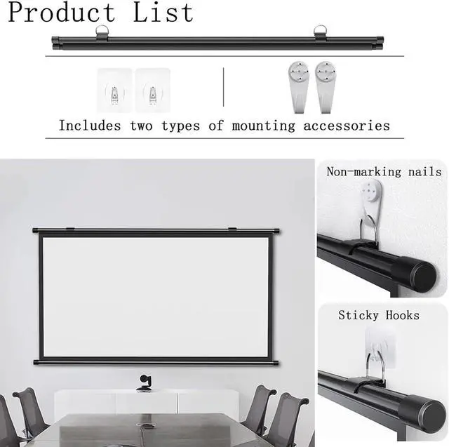 The wall-mounted projection screen can be mounted on the wall with adhesive hooks, and the spacing can be freely adjusted as needed by moving the hanging ring left or right, giving you the flexibility to choose the ideal setting for you.
