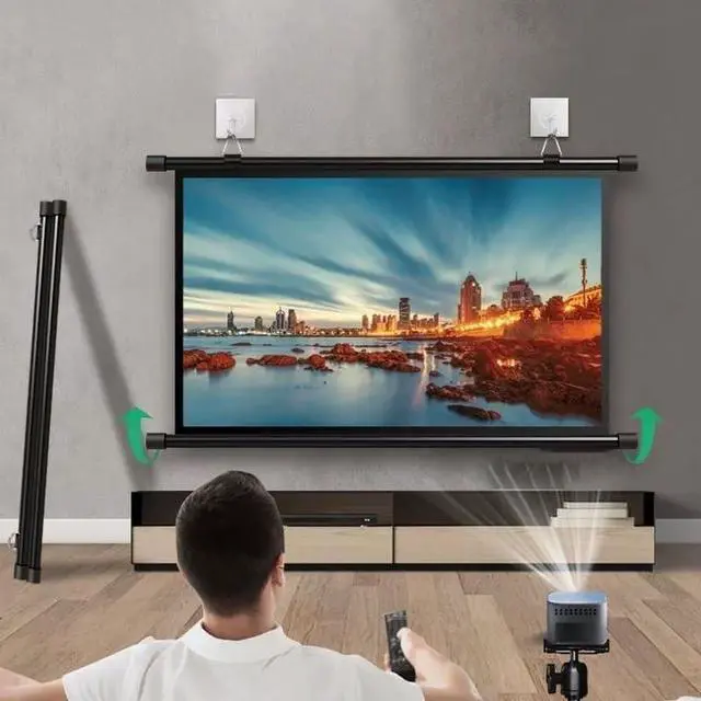 The projector screen is free of holes to install without hurting the wall, hang it as you like, compact and lightweight, the reel design is easy to store and carry, both indoors and outdoors can provide you with convenience