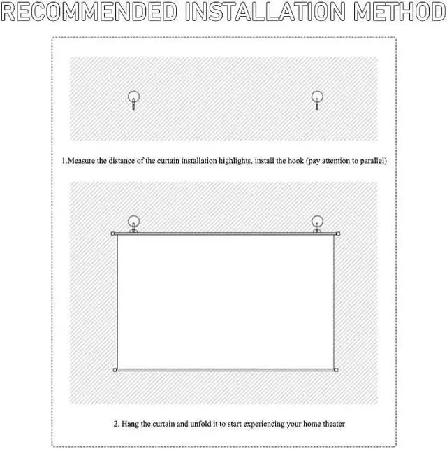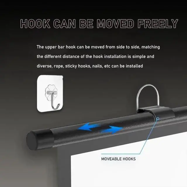 Convenient projector screen hole-free installation, fast and hassle-free, movable hooks with hanging, non-marking nail installation is fast and convenient, the top hooks can be adjusted left and right to freely match the hooks at different distances, the installation is not limited