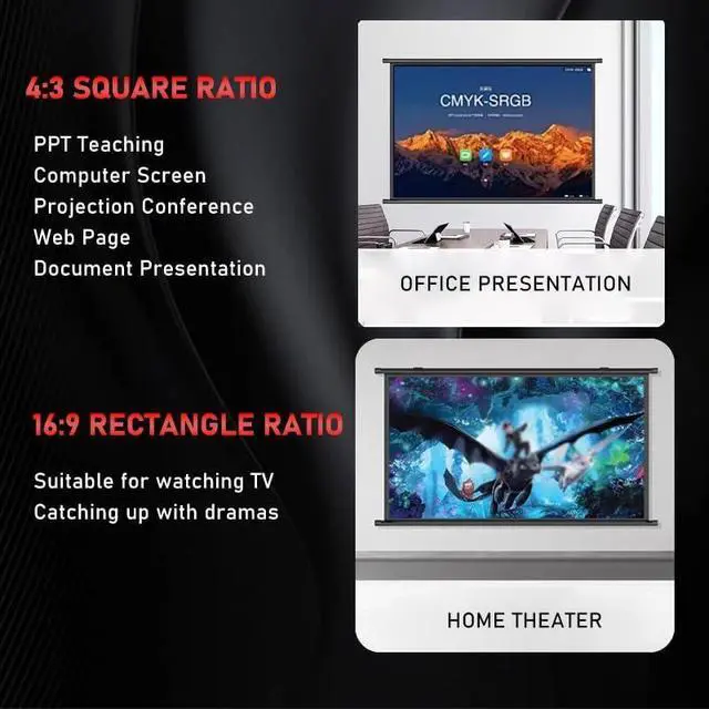 Movie screen two ratios, according to the use of the appropriate screen. 16:9 rectangular ratio suitable for home viewing, watching TV, 4:3 square ratio suitable for business office meeting teaching projection, etc