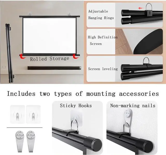 The projection screen is easy to install and can be mounted on the wall. Both hole-punch and wall-mounted installation methods can meet your needs, providing a better viewing experience and stabilizing the image.