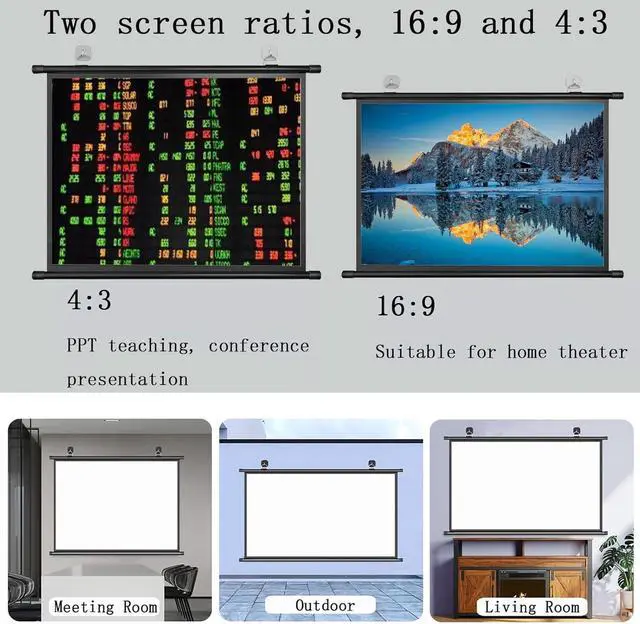 The projection screen is available in two image formats, 16:9 and 4:3, and the spacing can be freely adjusted as needed by moving the hanging ring left or right, giving you the flexibility to choose the ideal setting that suits you.