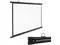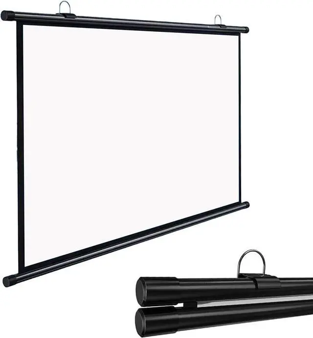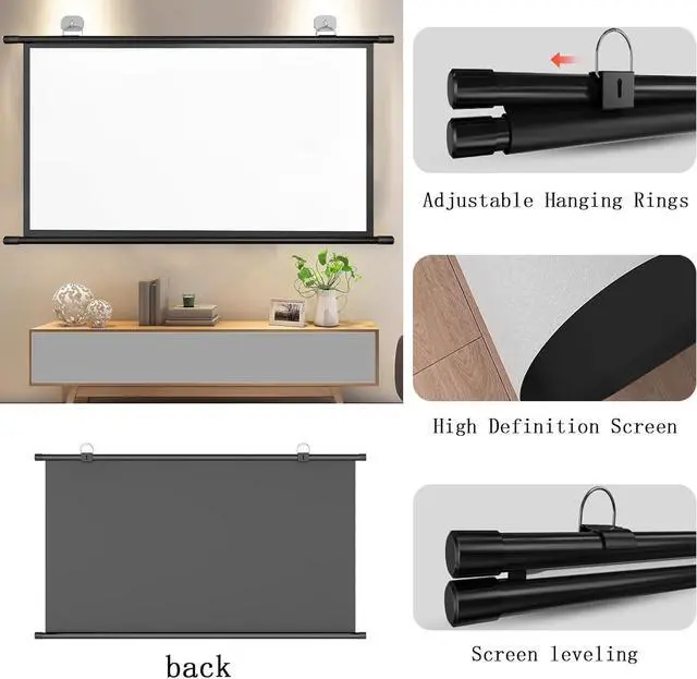The retractable projection screen has a scroll-type storage design that can be manually pulled down and rolled up for easy portability and storage. It can be installed on the wall with adhesive hooks to save space.