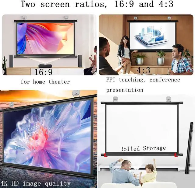 The screen has two ratios: 16:9 and 4:3. The 16:9 ratio is suitable for home theaters, games, and KTVs, and the 4:3 ratio is suitable for workplaces such as business, offices, schools, and educational PPT.