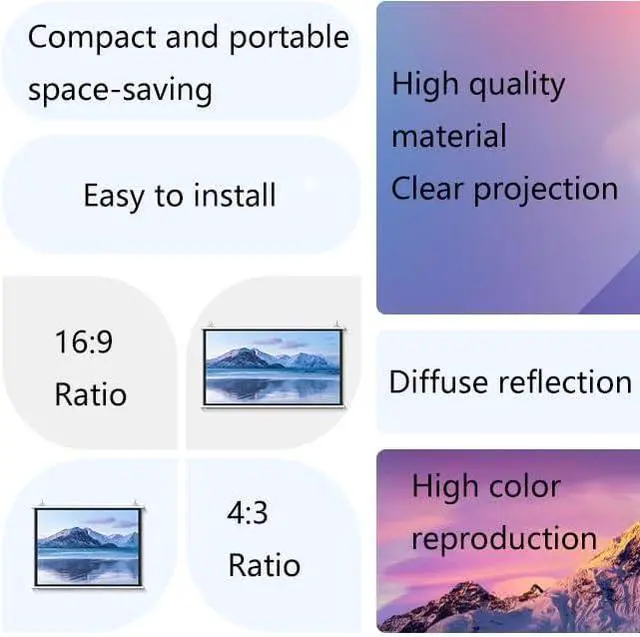 Format size: the projection screen adopts 4:3/16:9 screen format and 5 sizes of 30 inches, 40 inches, 50 inches, 60 inches and 72 inches, the movie screen supports 4K and high definition images, bringing you excellent visual enjoyment.