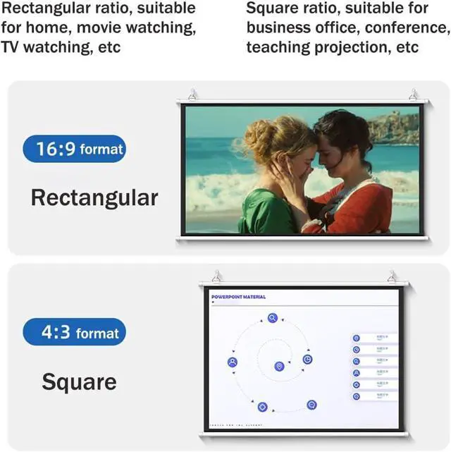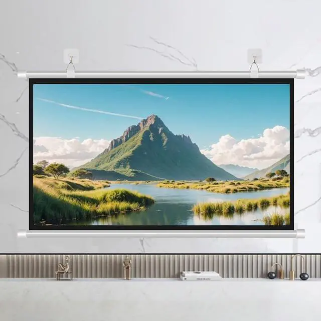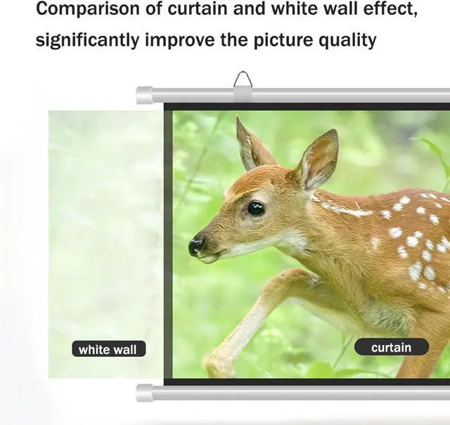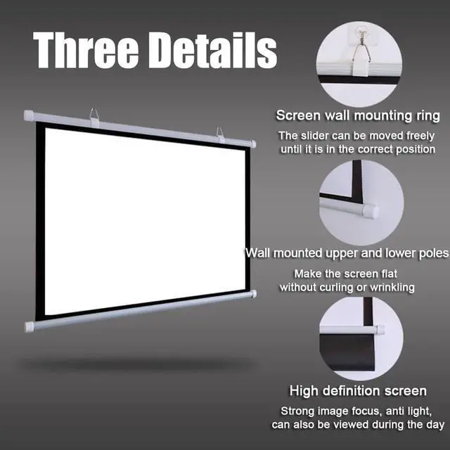 Portable: The manual drop down movie screen is designed to be lightweight, easy to store and carry, can be mounted on walls and ceilings, and can be easily hung in any situation.