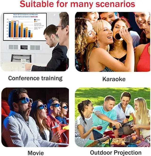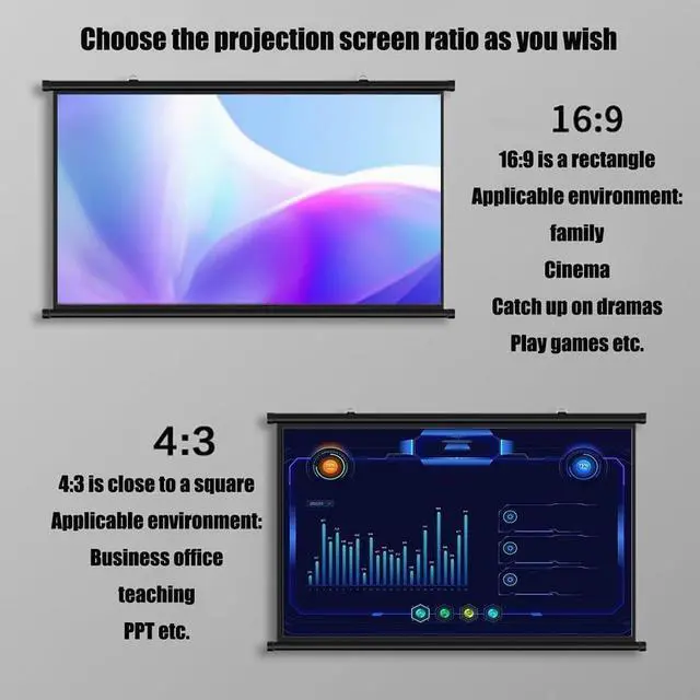 Suitable for Multiple Scenarios: 16:9 is rectangular, suitable for home theater, watching movies, watching TV series, playing games, KTV, etc. 4:3 is close to square, suitable for office, teaching, PPT presentations, business projections, etc.