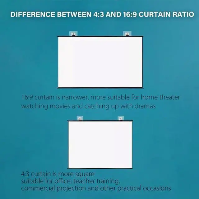 sense of detail: curtain wall mounted ring can be moved at will hook position until the correct, wall mounted up and down rod can make the curtain flat without curling edges and wrinkles, high-definition screen surface can make the screen focusing strong, light resistance, daytime also can see