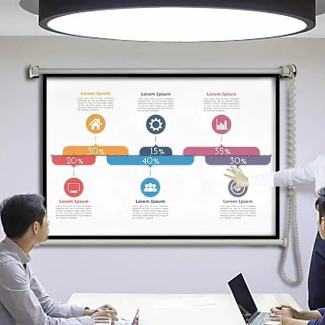 Manual pull-down projector screen with bead chain, full of details, hand-pulled bead chain descending without jamming, pull and stop. Can be adjusted to the right height according to their own needs, the whole process link details are very sophisticated