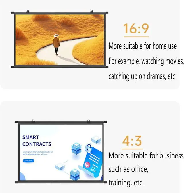 Scenario: 16:9 projection screen is rectangular, suitable for home theater, play games, catch up with the drama, singing, etc., 4:3 projection screen is square, suitable for business office school teaching PPT and other workplaces