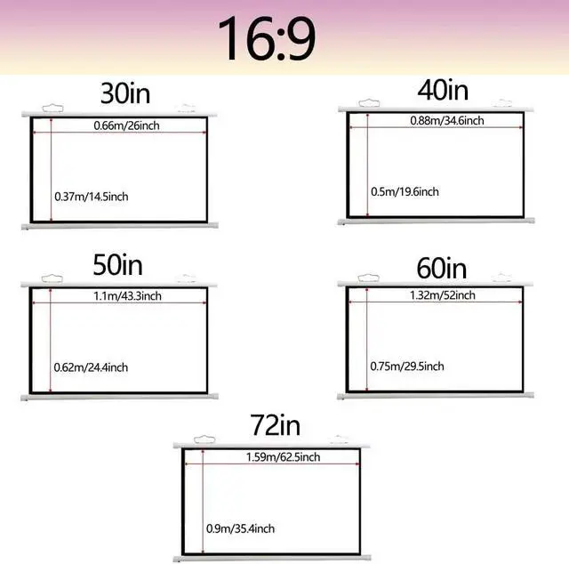 Sizes: 4:3/16:9 format, 30 inches, 40 inches, 50 inches, 60 inches, 72 inches
