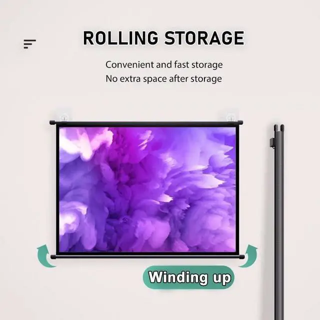 Installation: Our projector screen is easy to install, just need to stick the hook firmly to the place where you need to project, hang the projection screen well and adjust it to the right height to keep the screen stable and also bring better viewing experience.