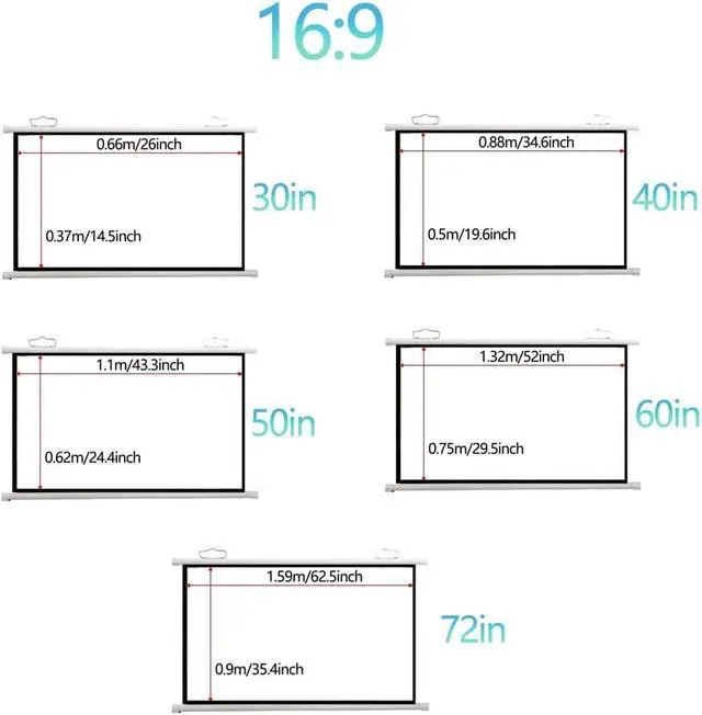Screen Area: 30in-4:3 (0.6x0.45m) 30in-16:9 (0.66x0.37m), 40in-4:3 (0.81x0.6m) 40in-16:9 (0.88x0.5m), 50in-4:3 (1.01x0.76m) 50in-16:9 (1.1x0.62m), 60in-4:3 (1.2x0.9m) 60in-16:9 (1.32x0.75m) ,72in-4:3(1.46x1.1m)72in-16:9(1.59x0.9m)