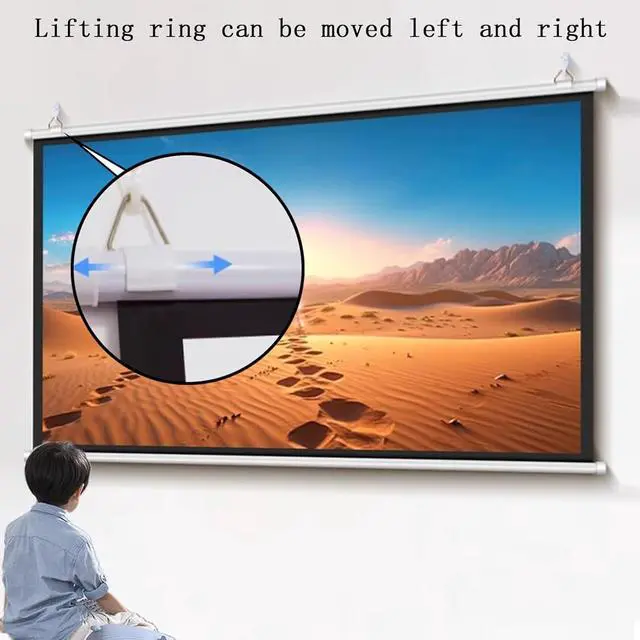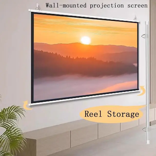 The manual pull-down projection screen can be stored in a roll for easy carrying and storage. It can be installed on the wall with adhesive hooks without drilling holes, making it easy to install.