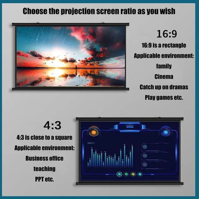 Screen Format: With a screen format of 4:3/16:9, 30inch , 40inch , 50inch , 60inch , 72inch, our projector screen supports both standard and widescreen display settings. It is compatible with 4K and Full HD images
