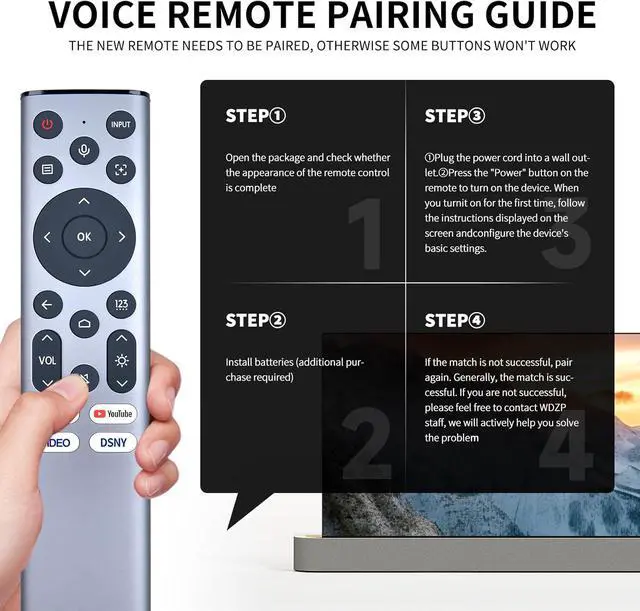 Easy PairingPlug the power cord into a wall outlet.Press the "Power" button on the remote to turn on the device. When you turnit on for the first time, follow the instructions displayed on the screen andconfigure the device's basic settings. (Package contains 1* remote control &1* instruction manual, battery not included)